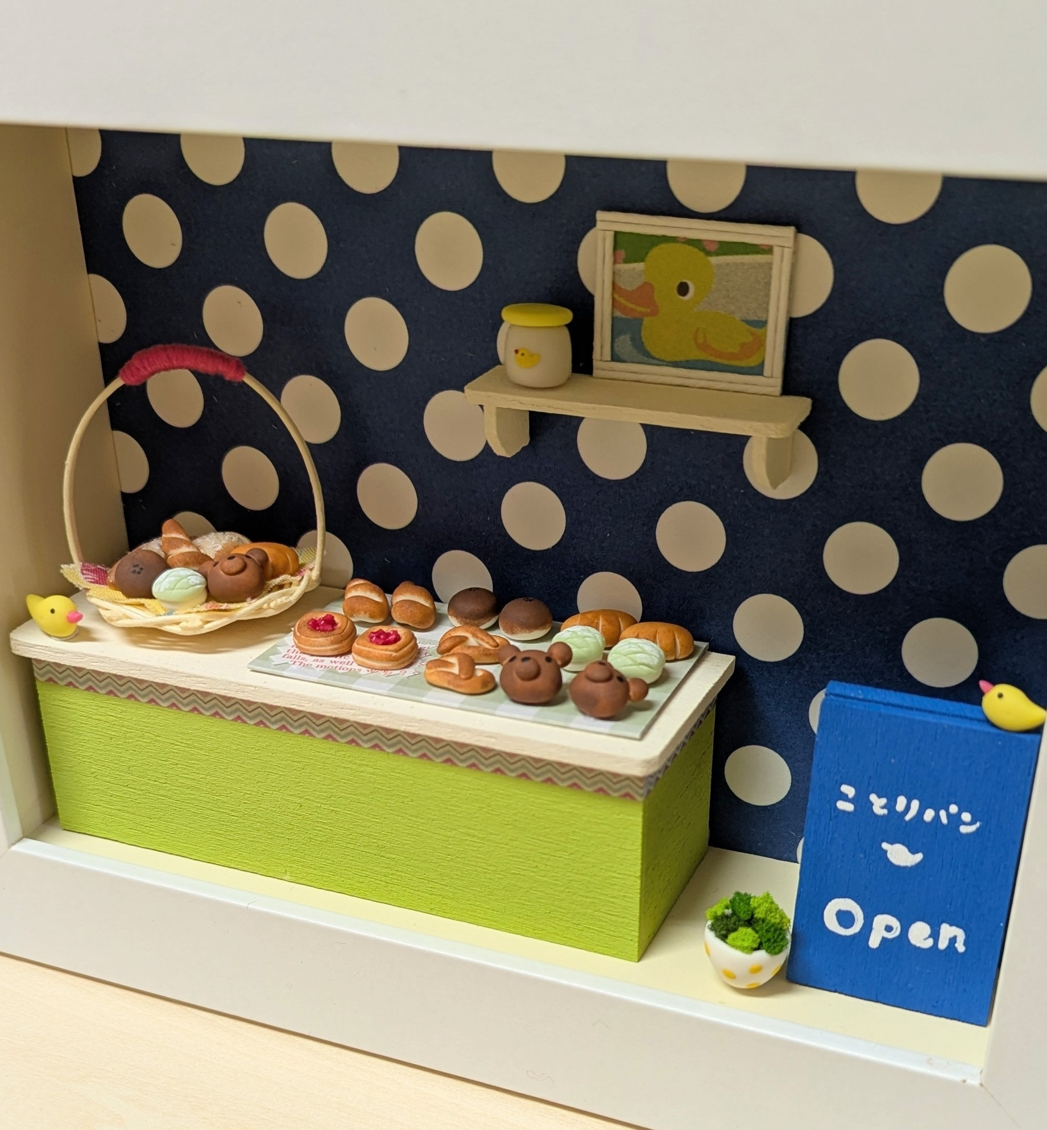 奥行付きの額縁の中にパン屋さんを作ります。トライアルで制作したかご盛りパンもこの作品の中に入れていきます。