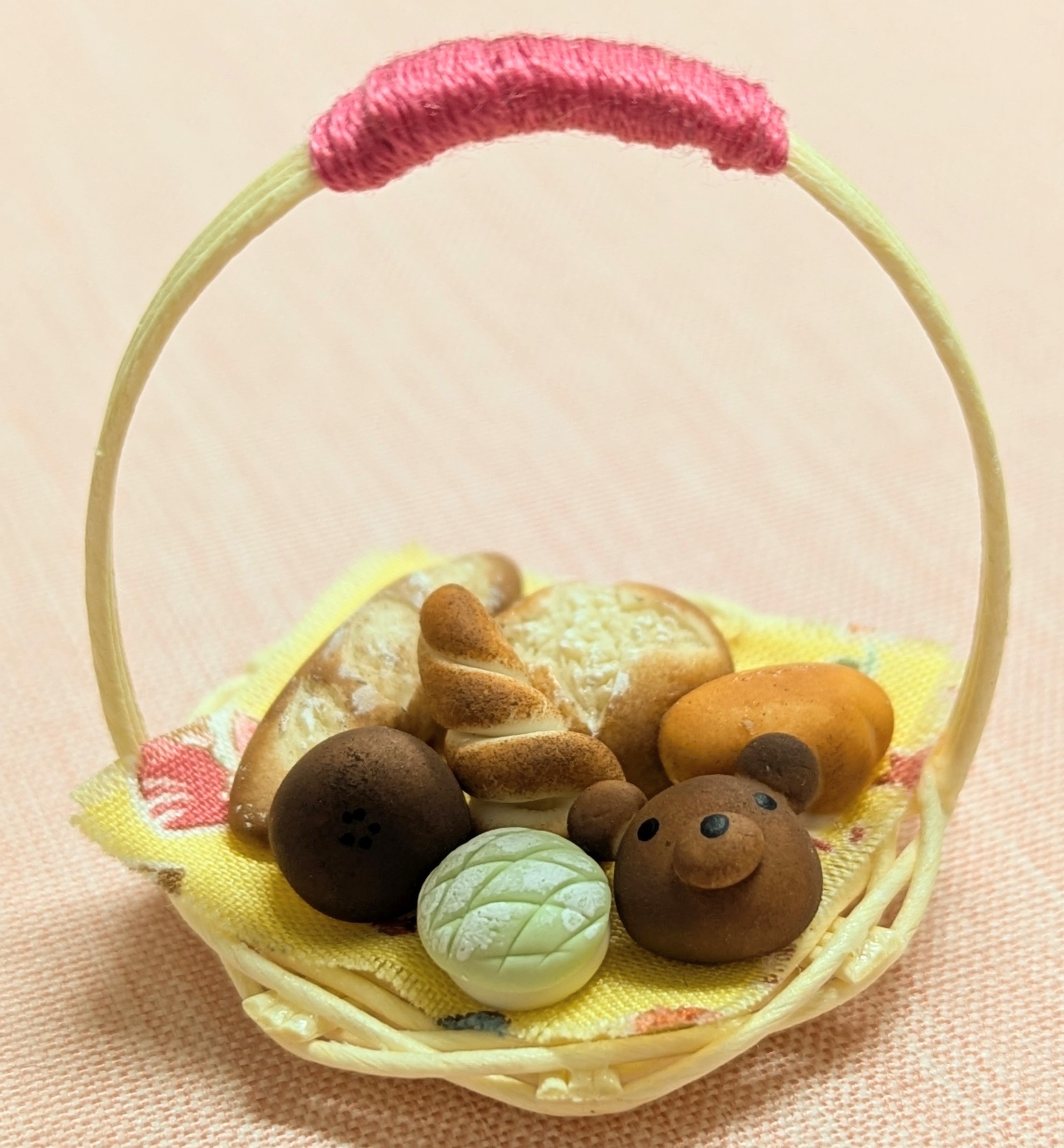 奥行付きの額縁の中にパン屋さんを作ります。トライアルで制作したかご盛りパンもこの作品の中に入れていきます。